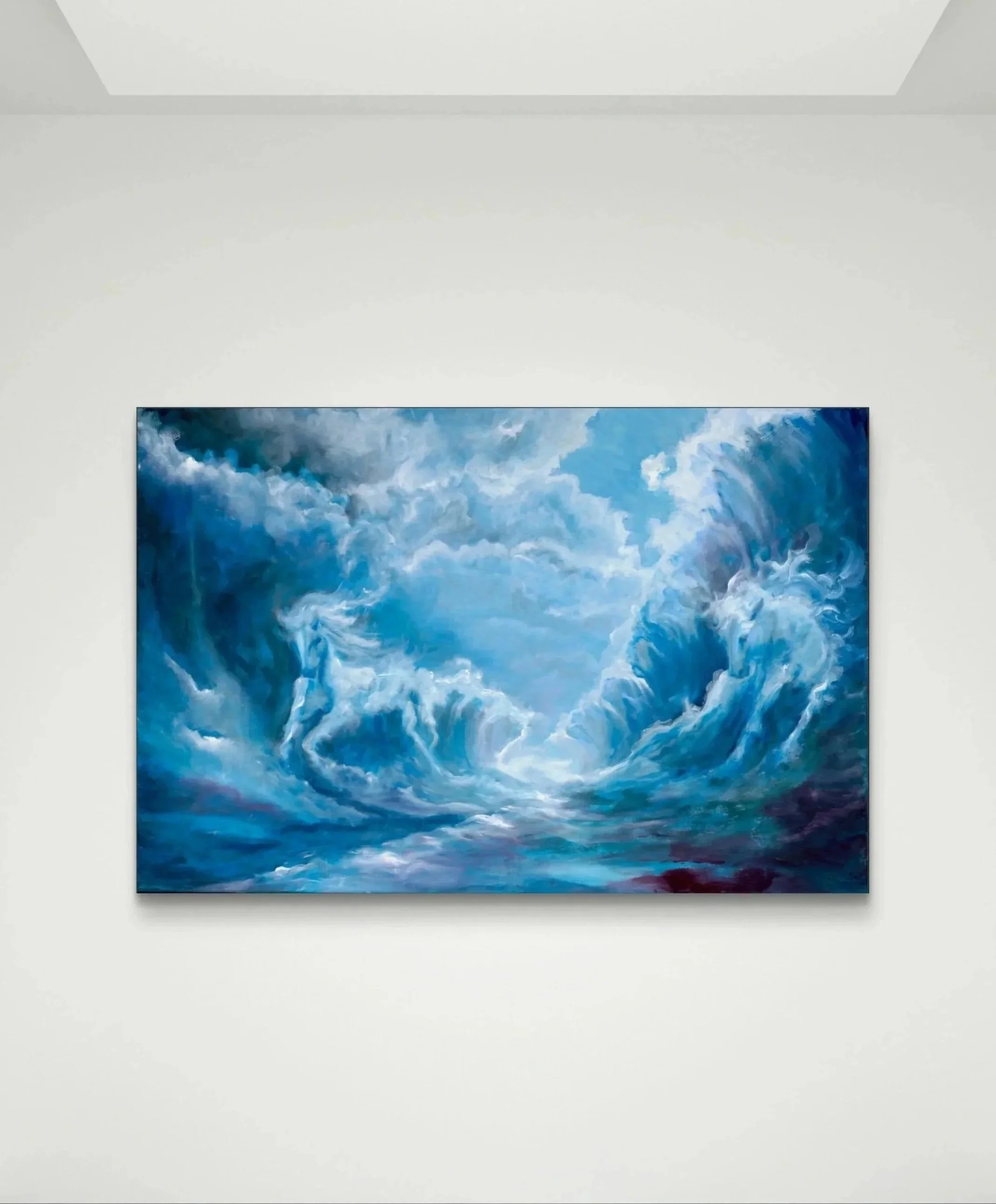 Oil on linen canvas, 36×48″I created this piece during a season of answered prayers. The shell at the base mirrors the open hands of benediction—an image of humility and readiness to receive God’s blessings, forgiveness, and peace. The wave descending into the shell represents those divine answers—overflowing, awe-inspiring, and at times, overwhelming in their grace.